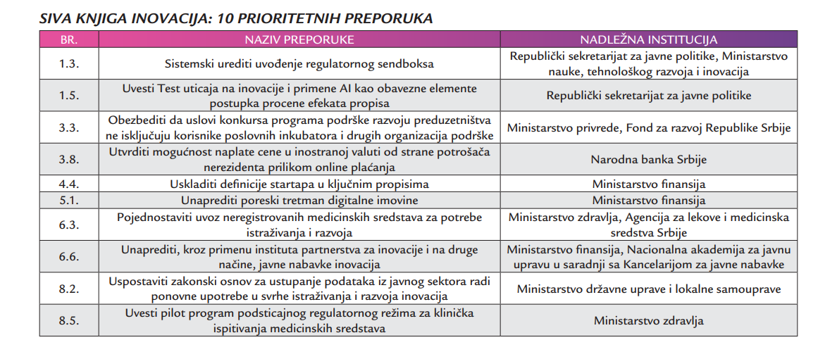 Siva knjiga inovacija, nastala po uzoru na najpoznatiju NALED-ovu publikaciju – Sivu knjigu propisa, tokom prethodna dva izdanja je postala prepoznatljiv i pouzdan alat za identifikovanje regulatornih prepreka i predlaganje praktičnih rešenja u sektoru visokotehnološkog preduzetništva. Treće izdanje potvrđuje njen status kao standarda u praksi, objedinjujući inpute relevantnih aktera i pružajući smernice za dalji razvoj inovacionog ekosistema u Srbiji.